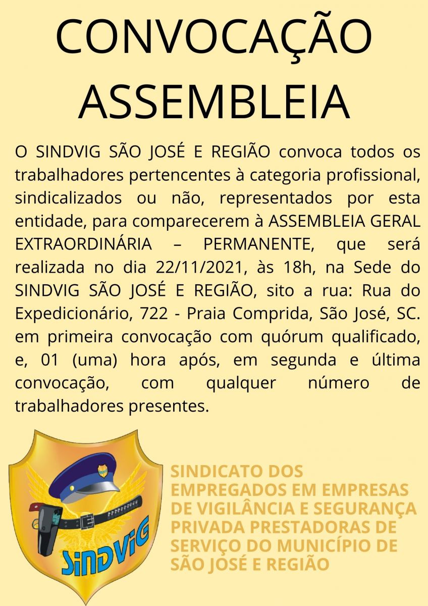 O SINDVIG SÃO JOSÉ E REGIÃO convoca todos os trabalhadores pertencentes à categoria profissional, sindicalizados ou não, representados por esta entidade, para comparecerem à ASSEMBLEIA GERAL EXTRAORDINÁRIA – PERMANENTE, que será realizada no dia 22/11/2021, às 18h, na Sede do SINDVIG SÃO JOSÉ E REGIÃO, sito a rua: Rua do Expedicionário, 722 - Praia Comprida, São José, SC. em primeira convocação com quórum qualificado, e, 01 (uma) hora após, em segunda e última convocação, com qualquer número de trabalhadores presentes, para deliberar sobre a seguinte ordem do dia:
