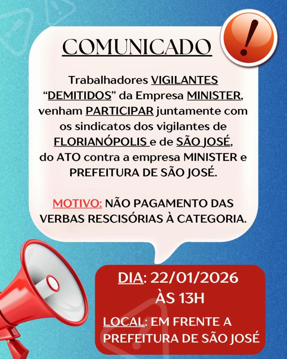 O Sindicato informa que a empresa Minister formalizou, no dia 15 de janeiro, comunicação oficial ao Sindicato relatando a impossibilidade de realizar o pagamento das verbas rescisórias dos trabalhadores vigilantes vinculados ao contrato da Prefeitura Municipal de São José.